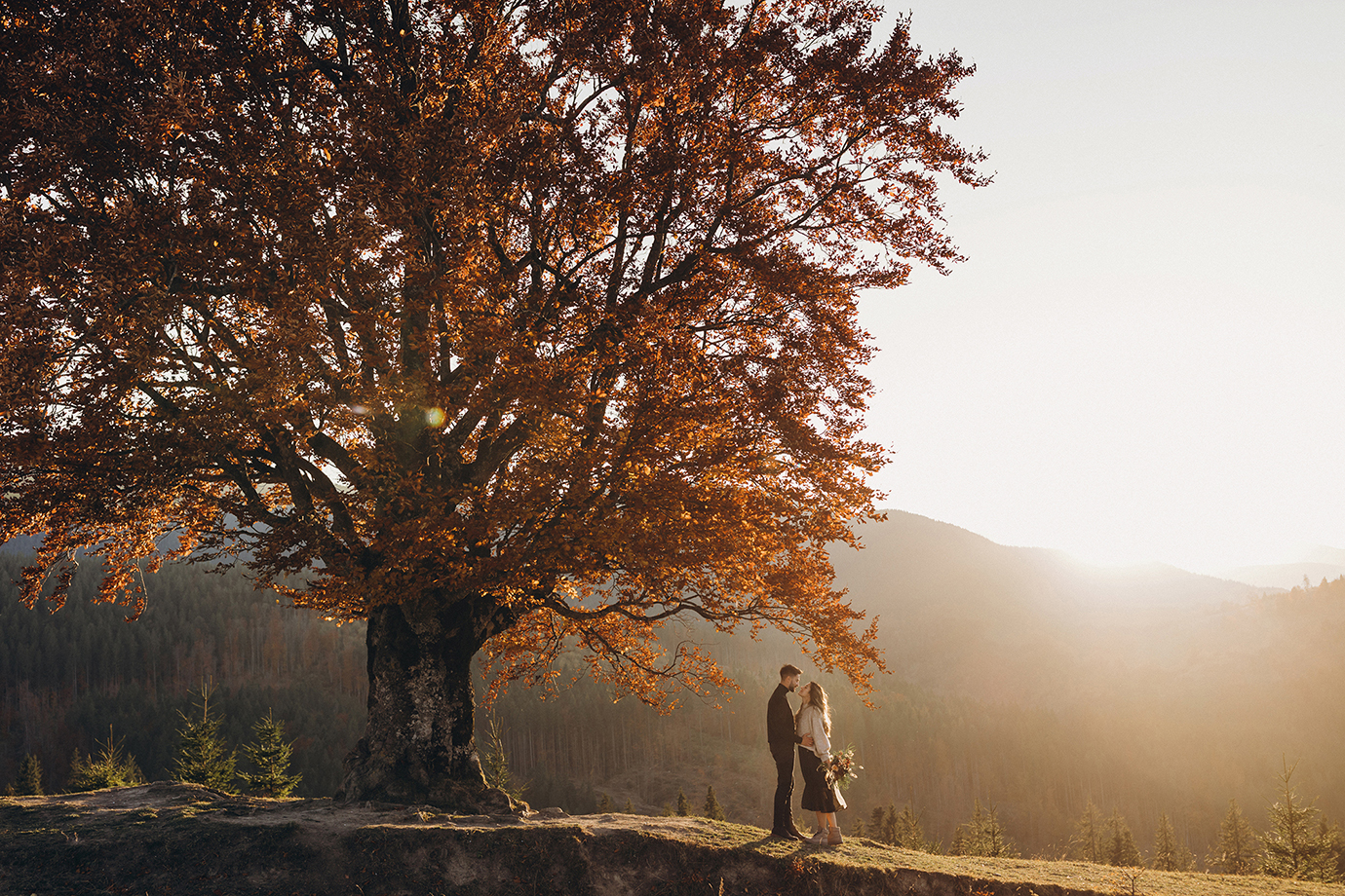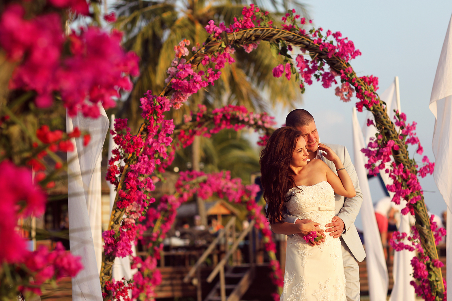 Portrait the groom and the bride standing back and kissing on the background of greenery. Wedding ceremony in Botanical green garden.