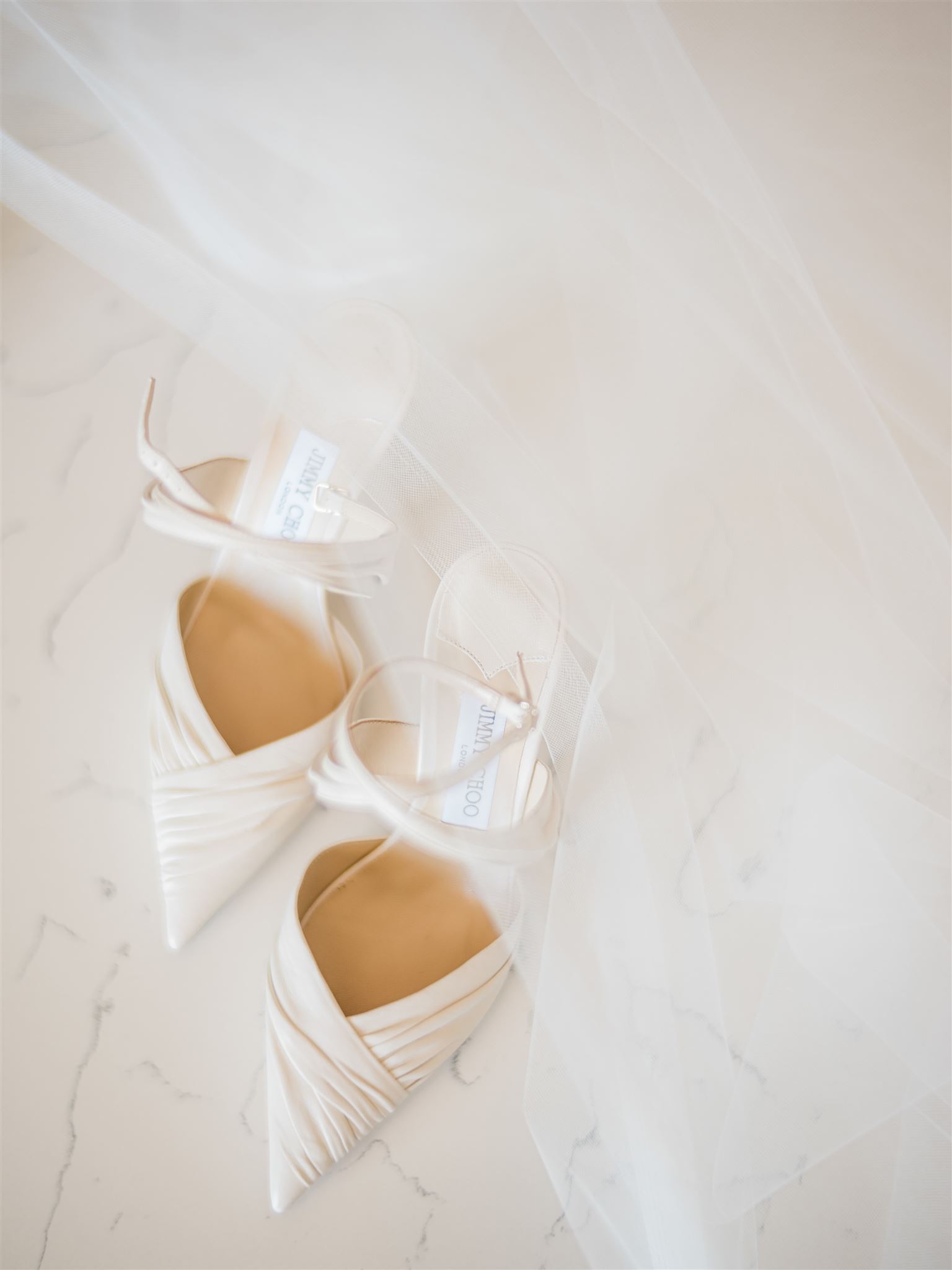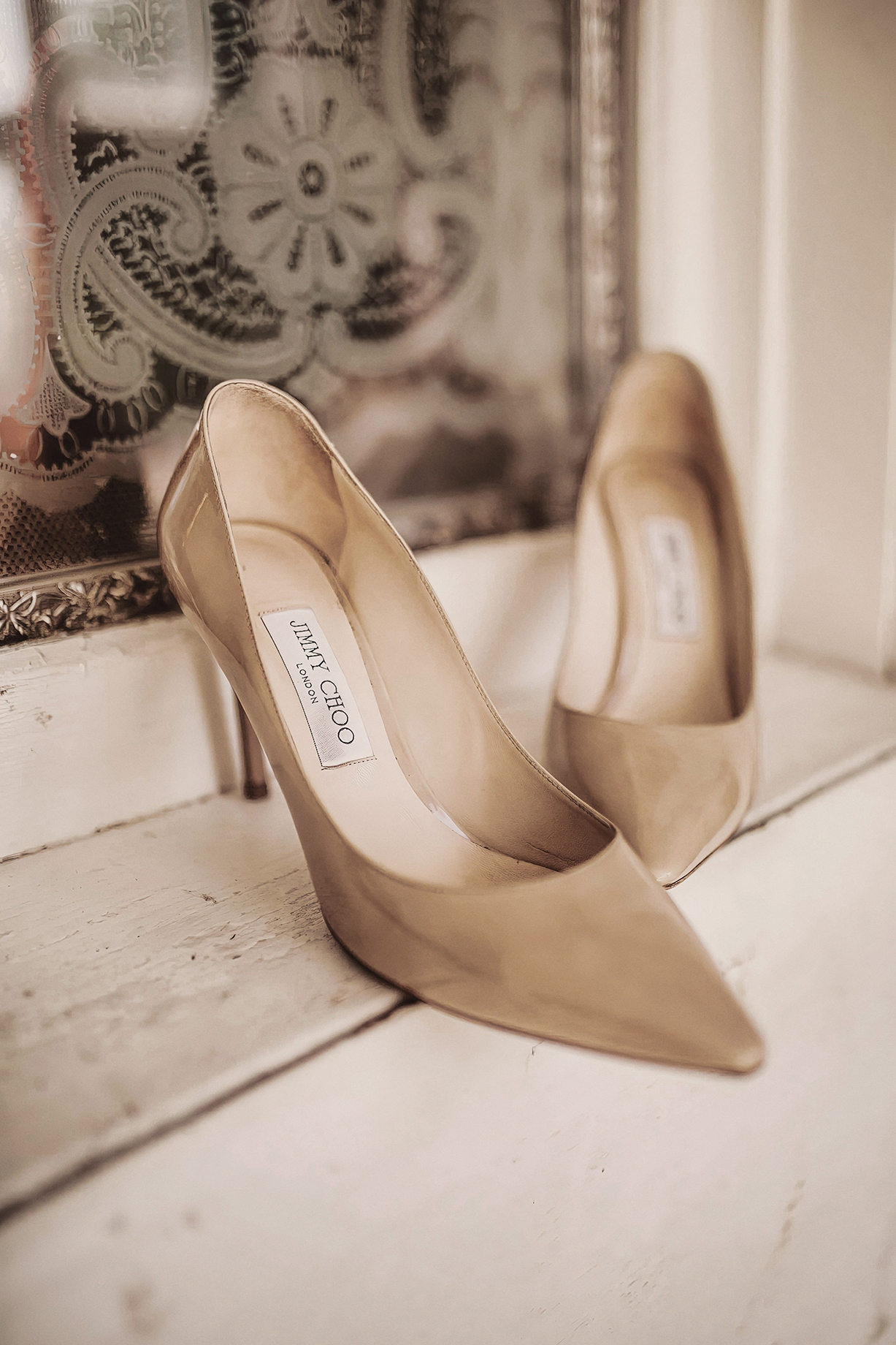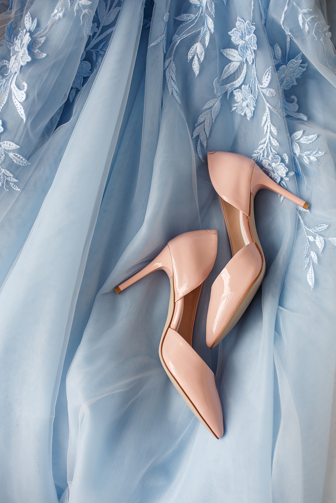 Pink bridal shoes on high heels on blue wedding dress. Marriage and wedding concept