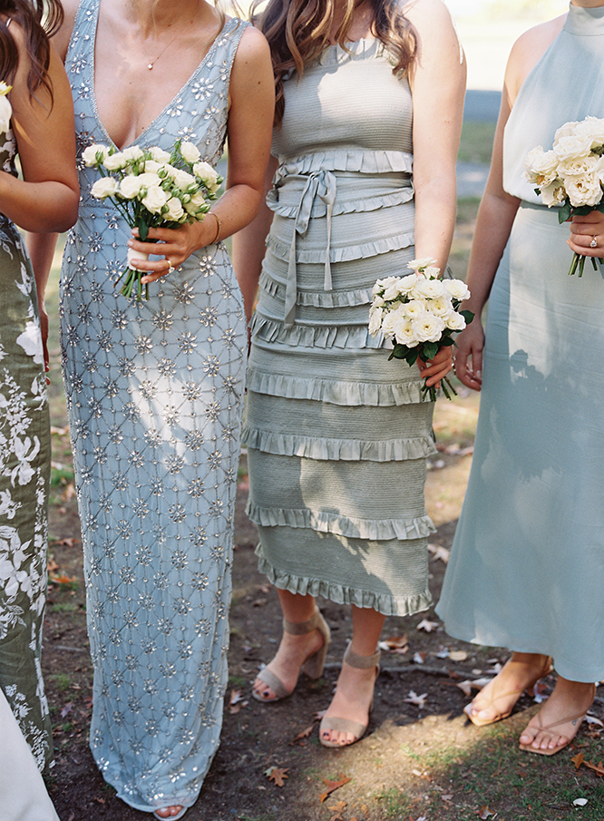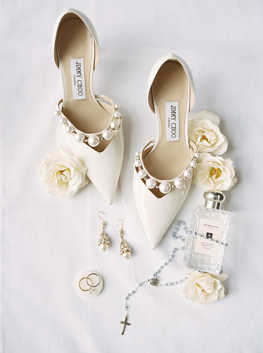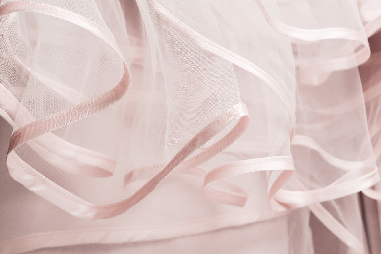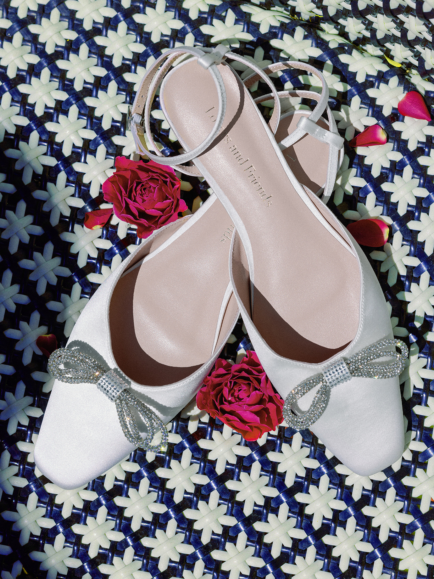 Pink bridal shoes on high heels on blue wedding dress. Marriage and wedding concept