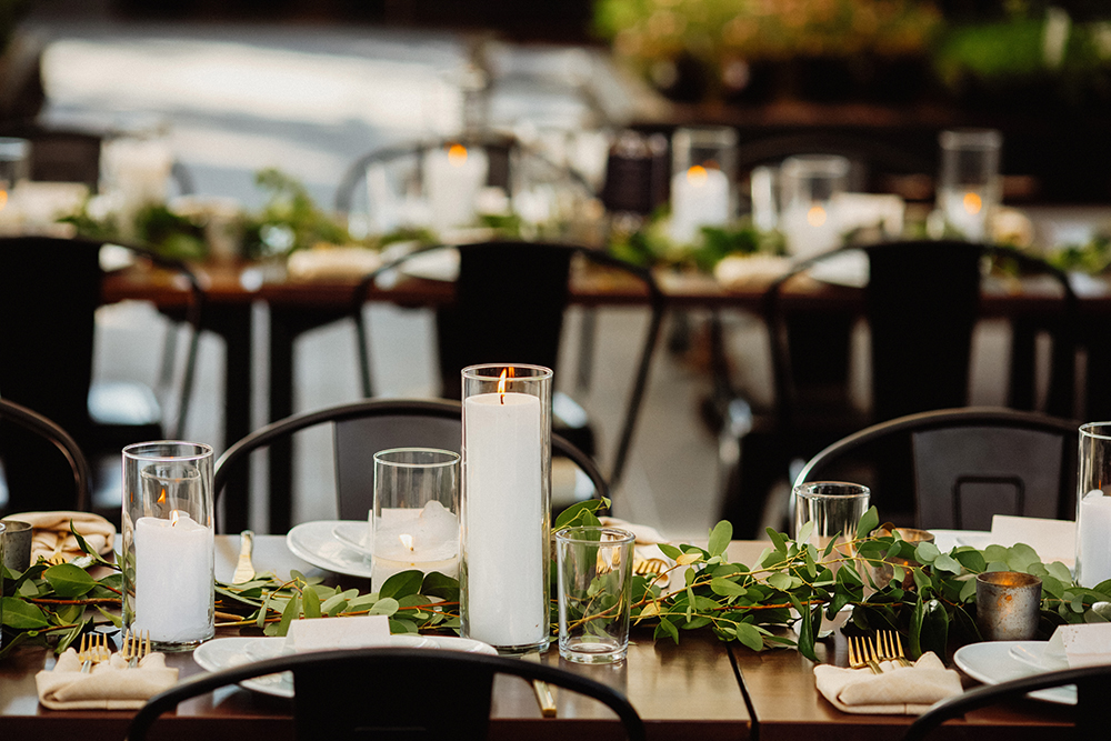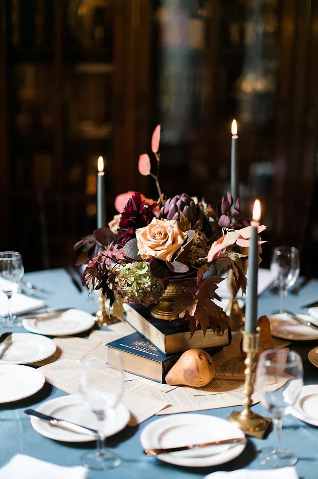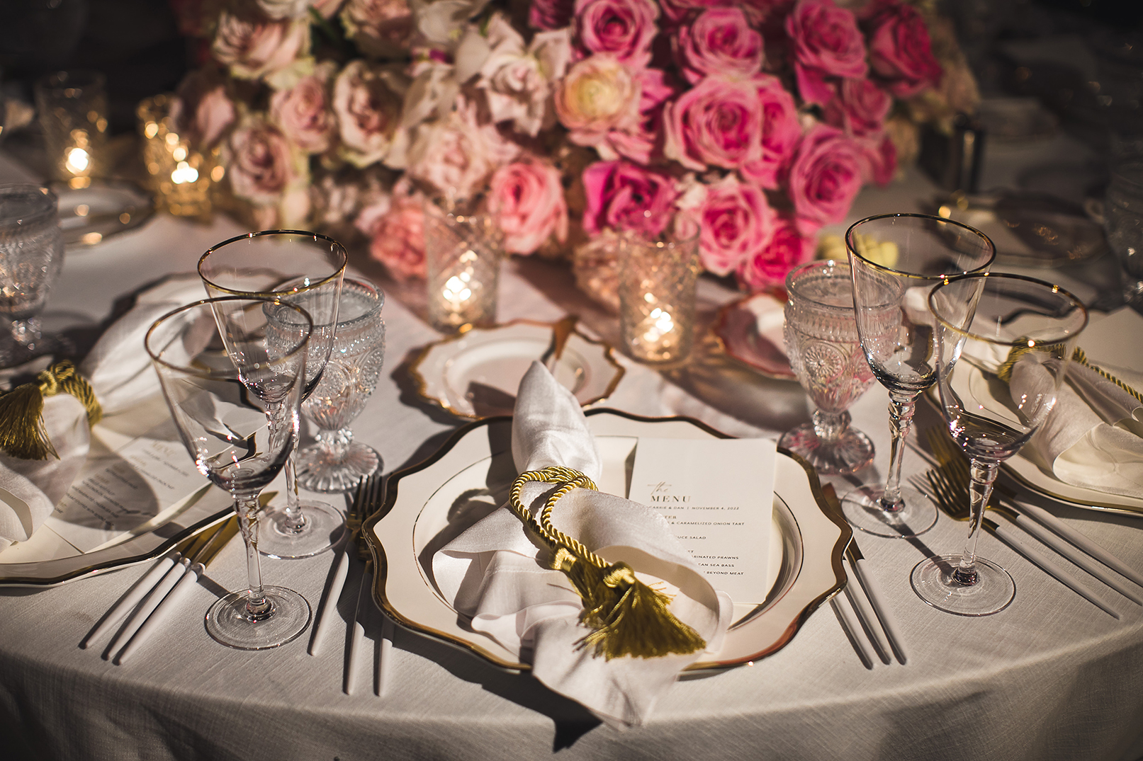 Elegant dark pink wedding banquet table with glasses, dishes and flowers decoration indoors in restaurant. Gorgeous long wedding table. Wedding decoration concept. Magenta color