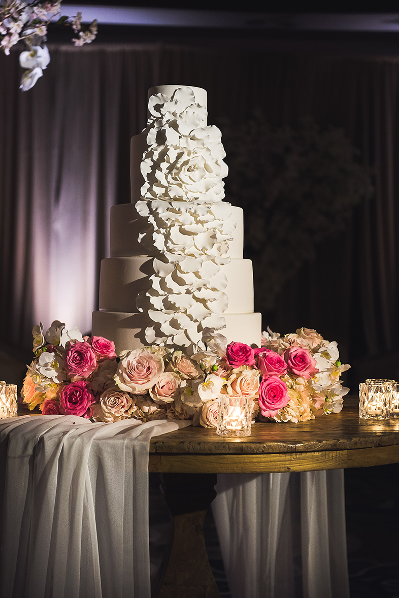 Elegant white wedding cake with flowers and succulents in boho style. Rustic Wedding Cake