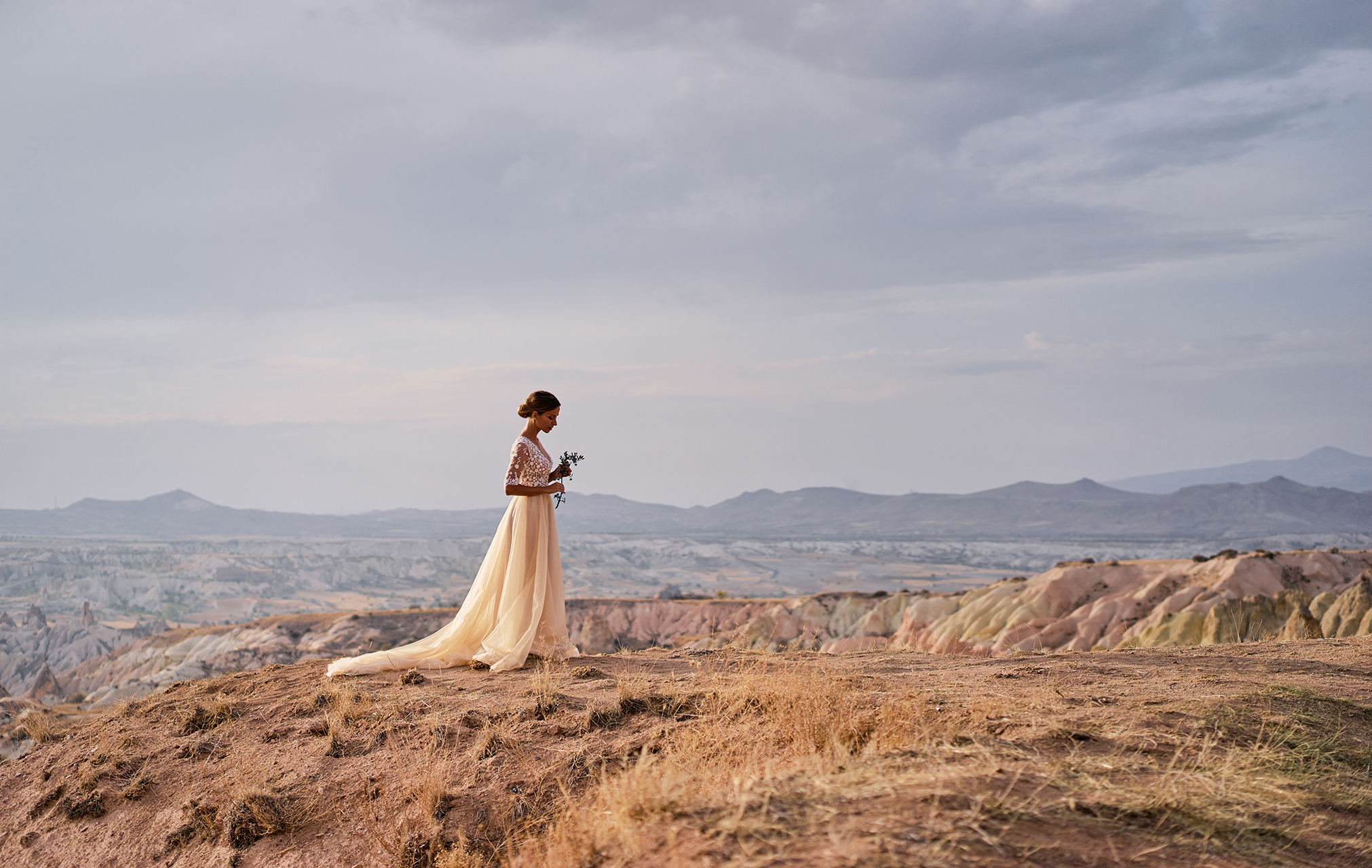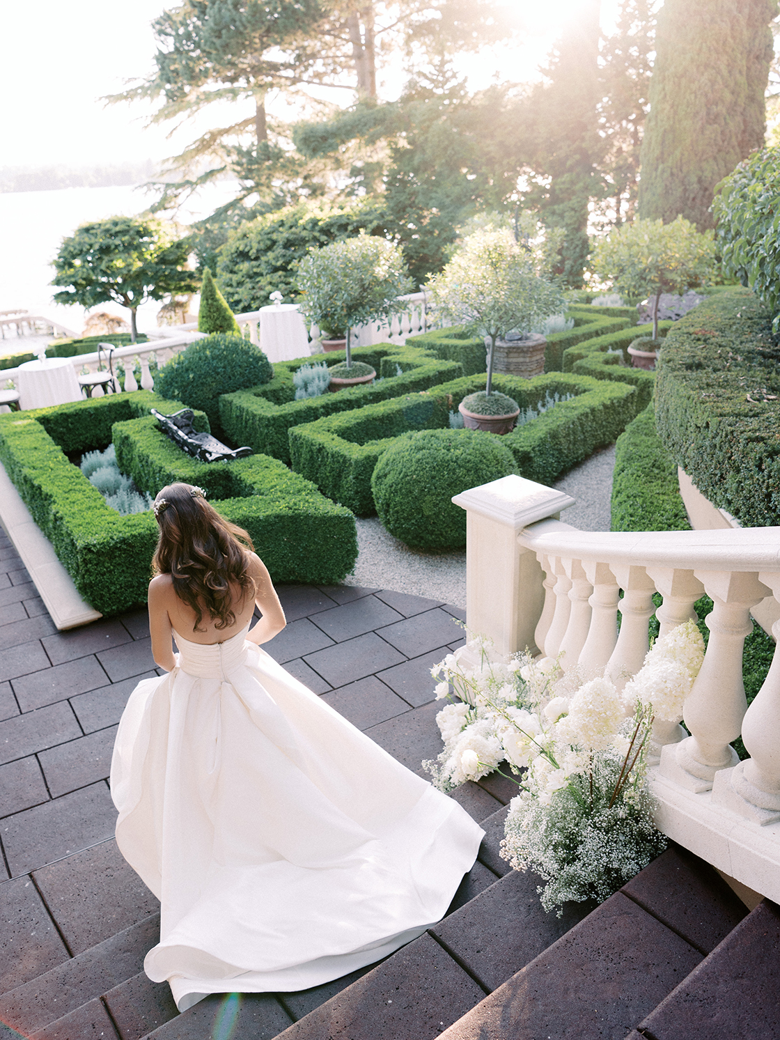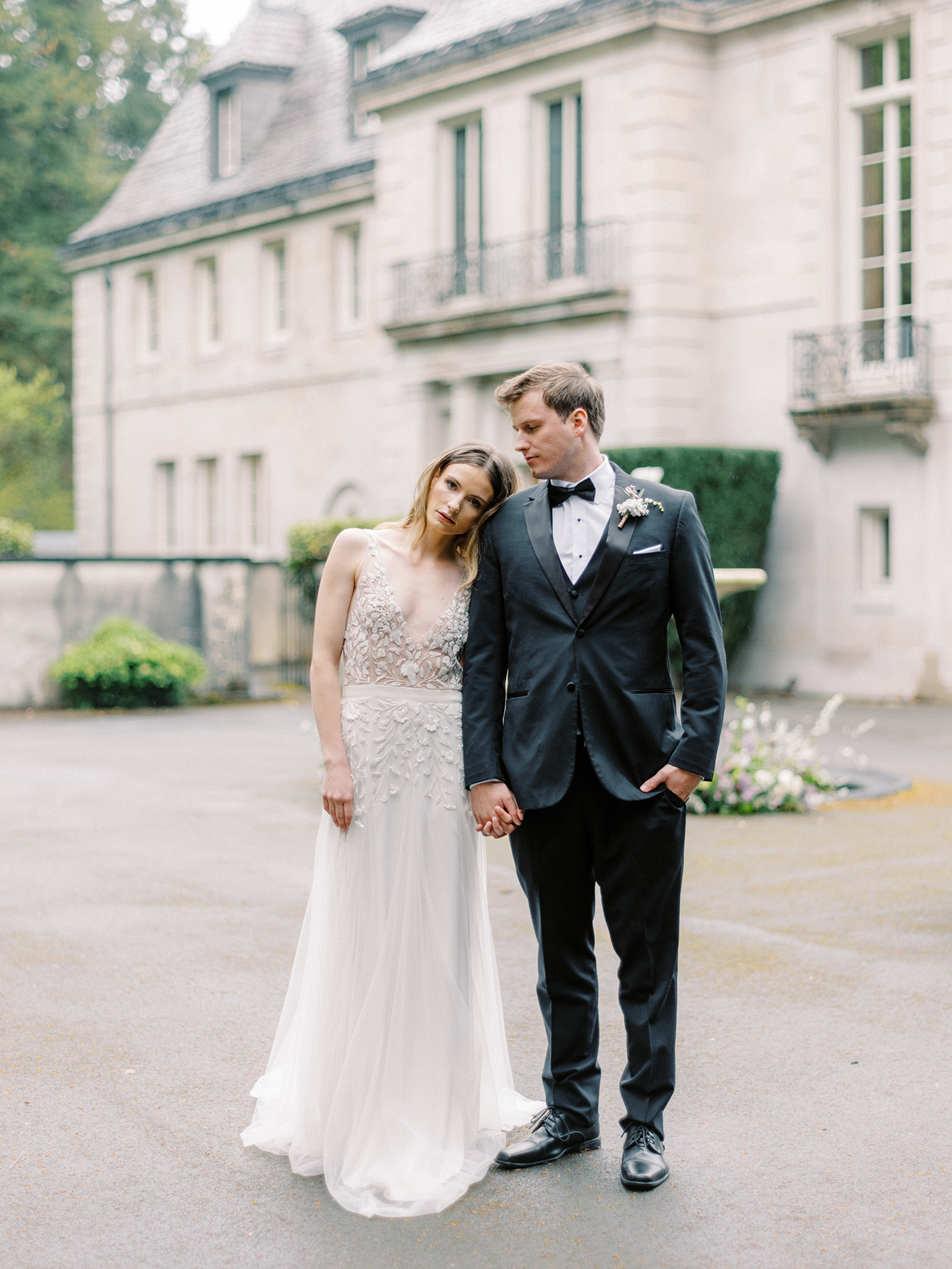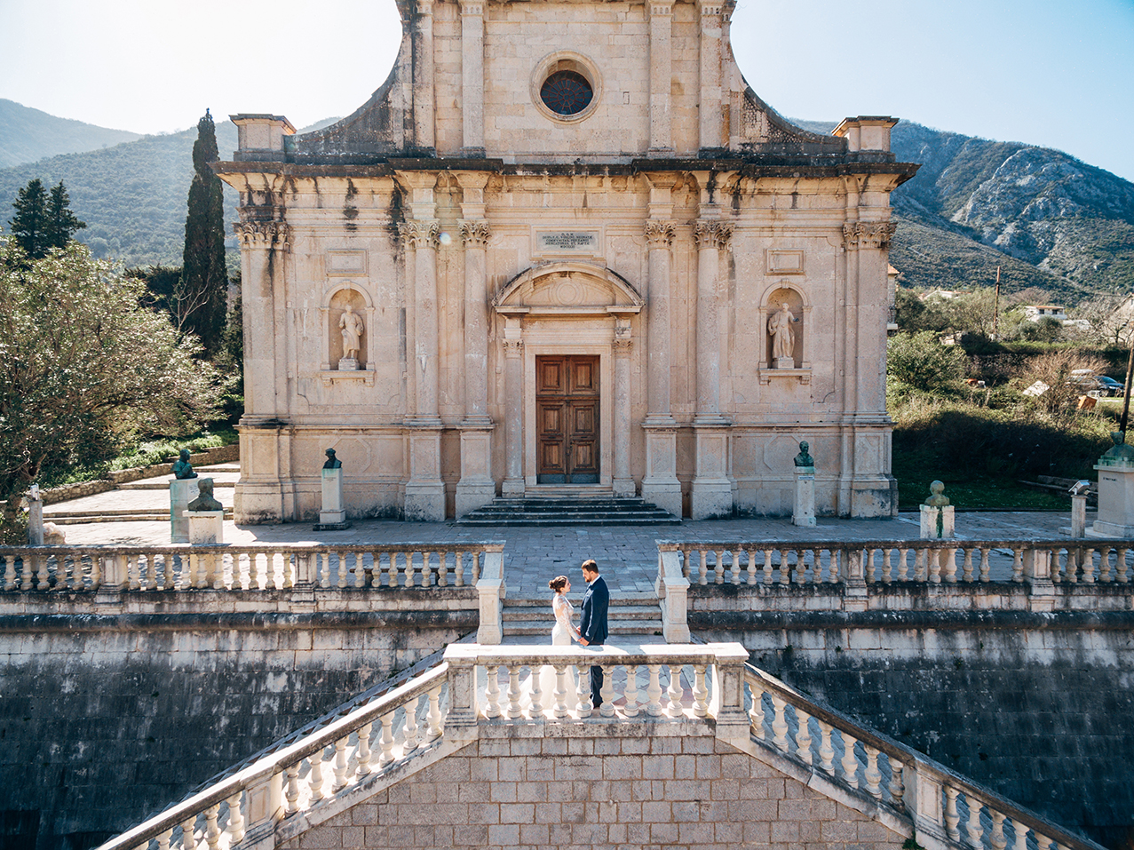 Bride and groom stand on the stone steps against the background of the Church of the Nativity of the Virgin in Prcanj. Montenegro. High quality photo
