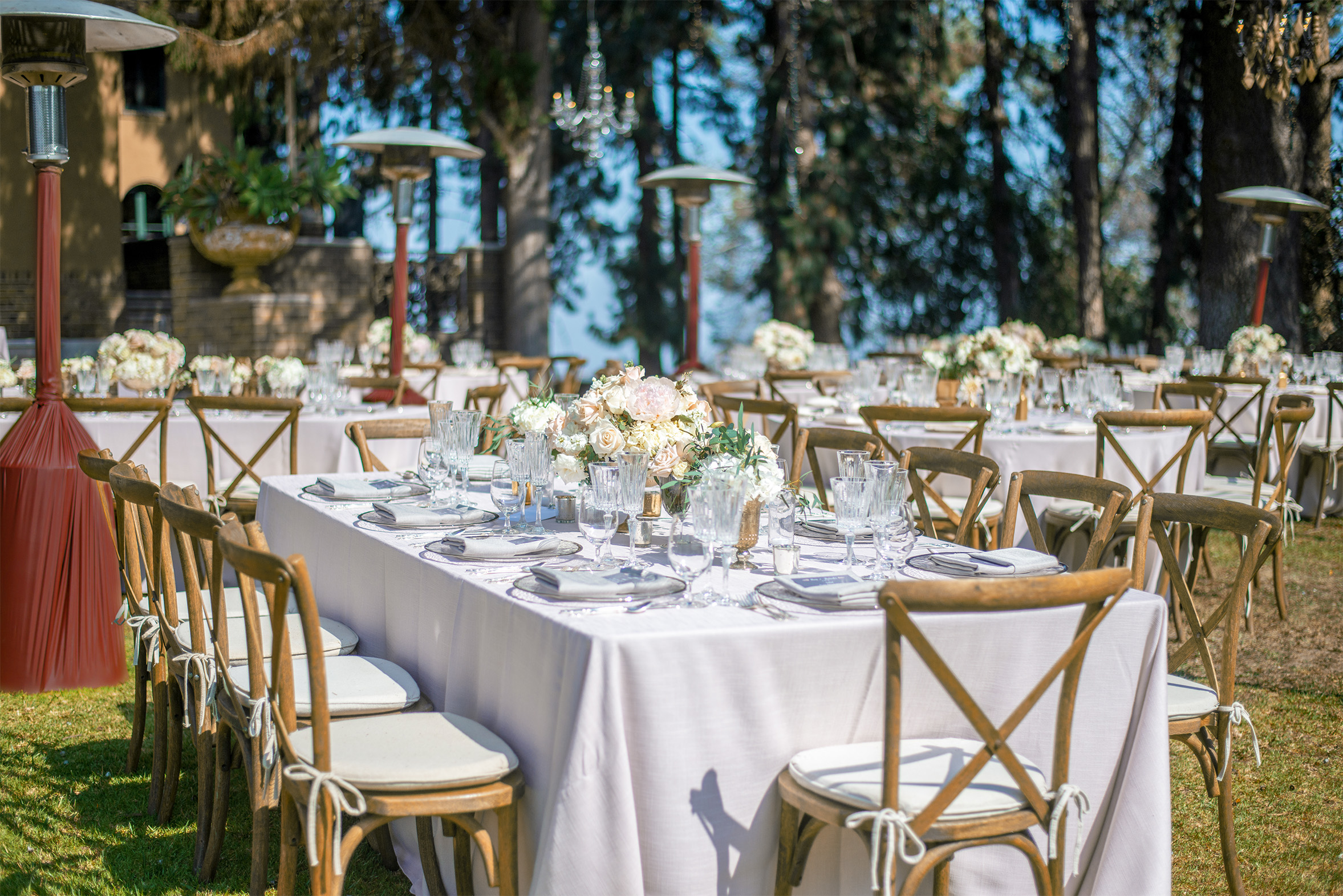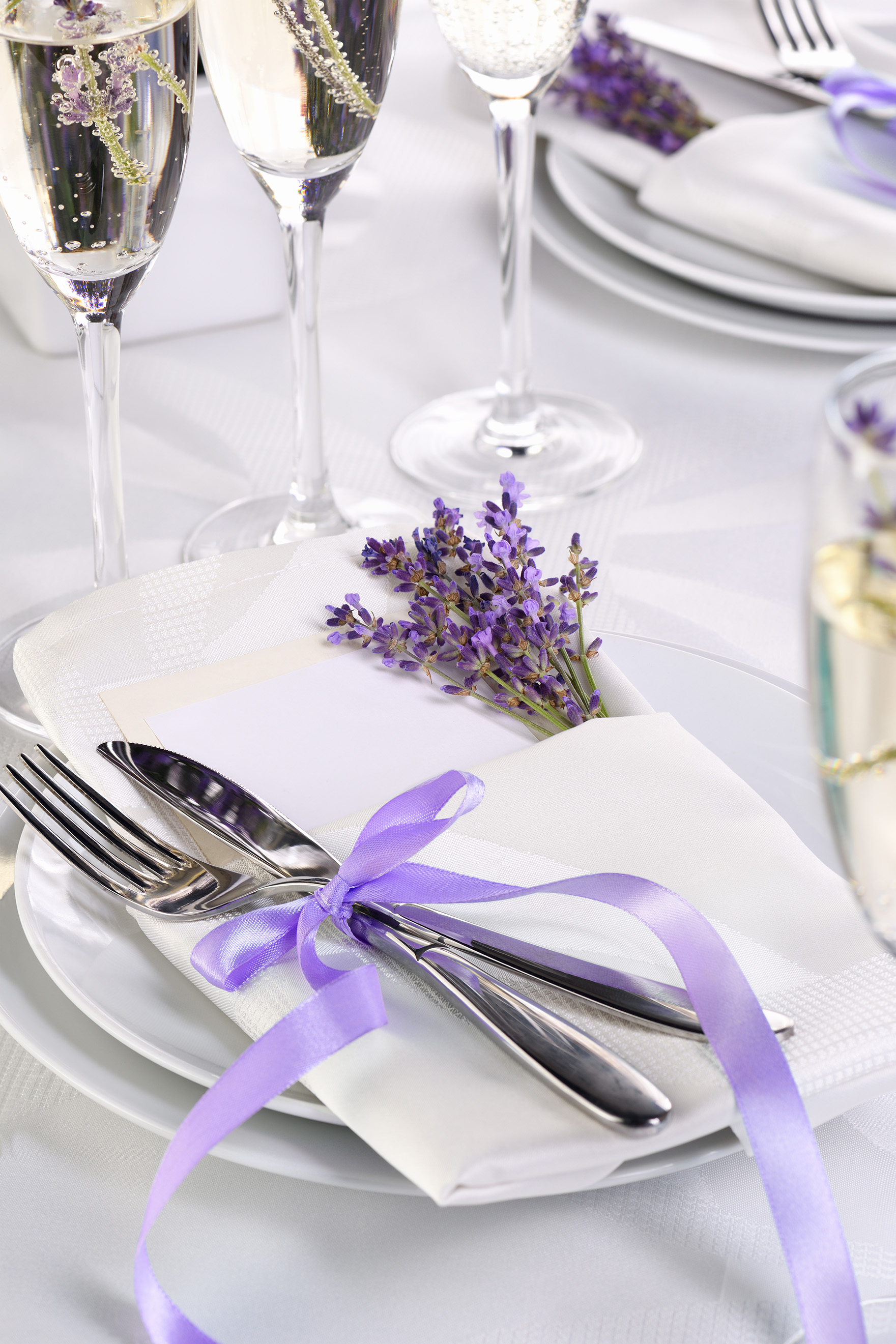 Dining table in Provence style, with Lavender Champagne, folded napkin with cutlery, decorated with fresh lavender. Detail of the wedding dinner. Wedding theme ideas.